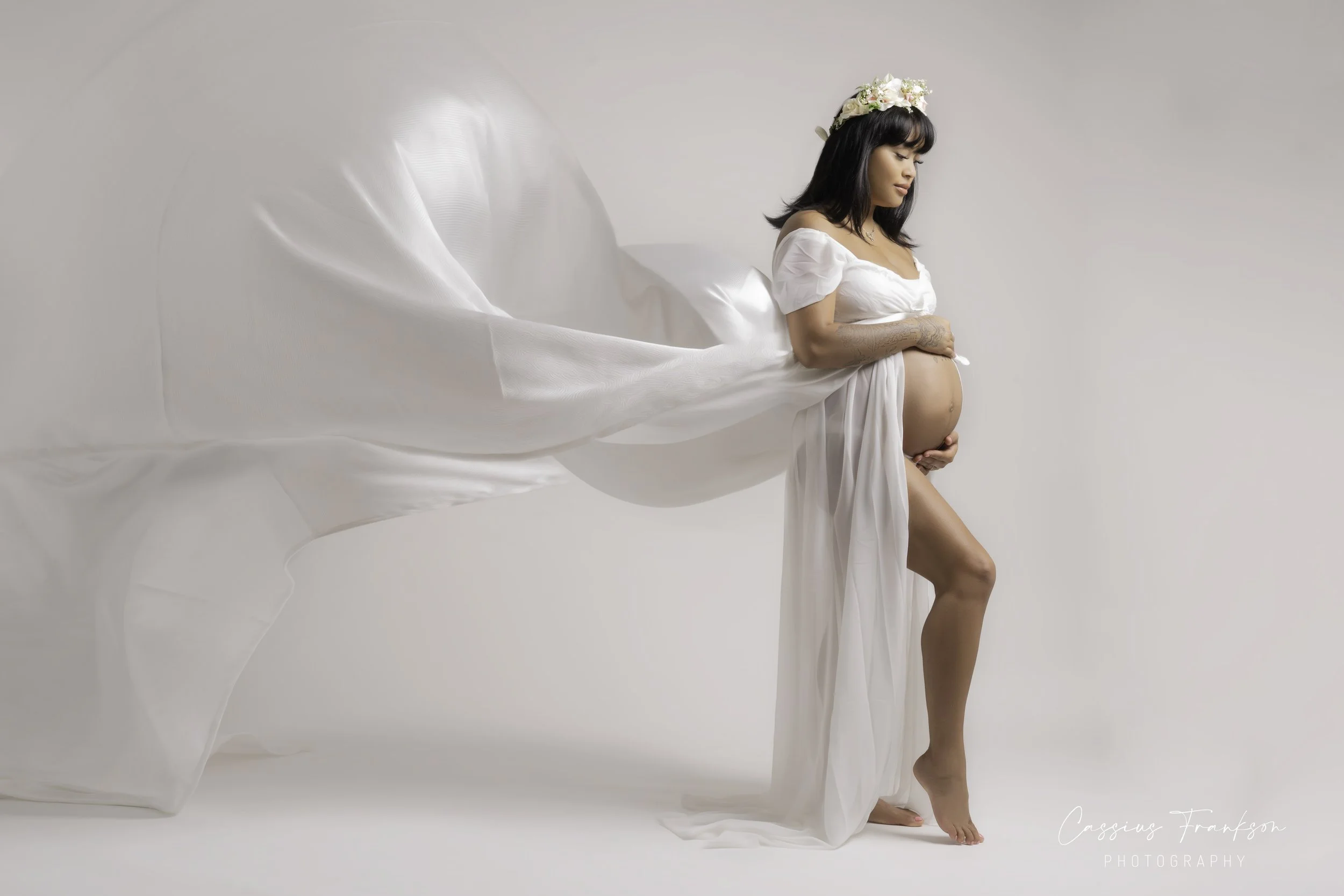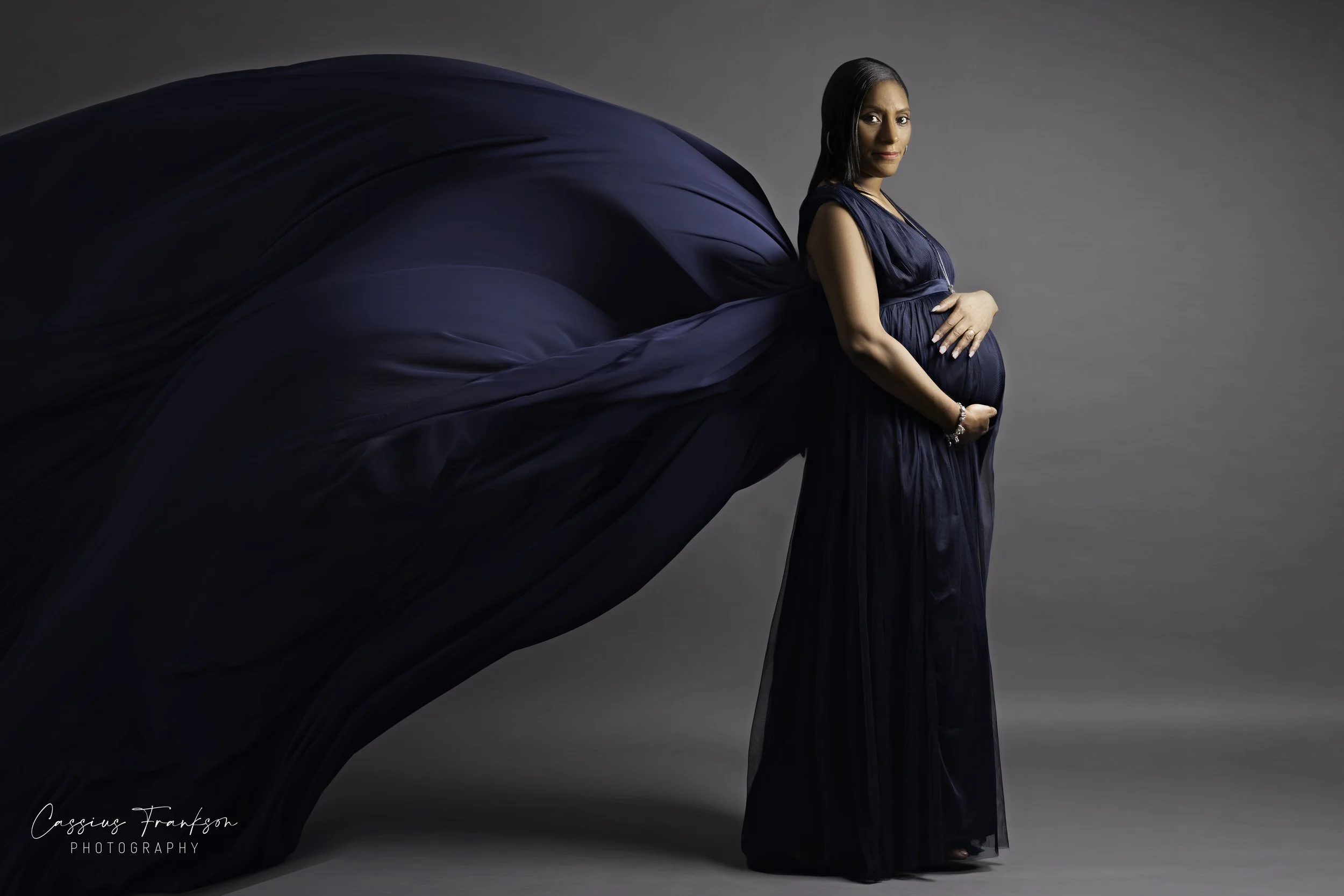 Fabrics play a vital role in maternity photography. Soft, flowing materials chosen with the client create movement, shape, and elegance. Having additional hands in the studio to guide, lift, or release fabric allows for controlled motion, adding drama and grace without compromising comfort.
